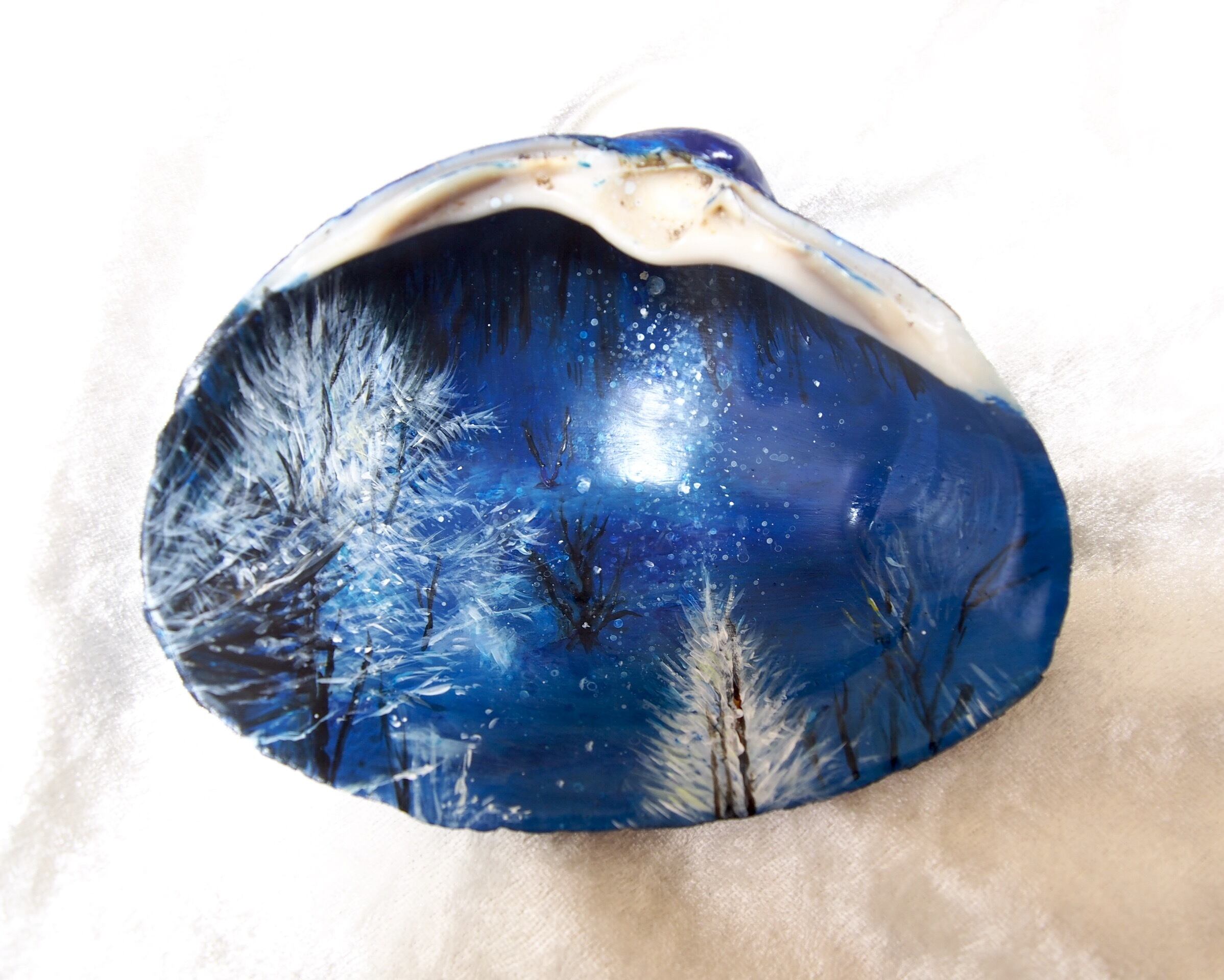 横10センチほどの、小樽の海で拾ったホッキ貝にアクリル絵の具で描いています。