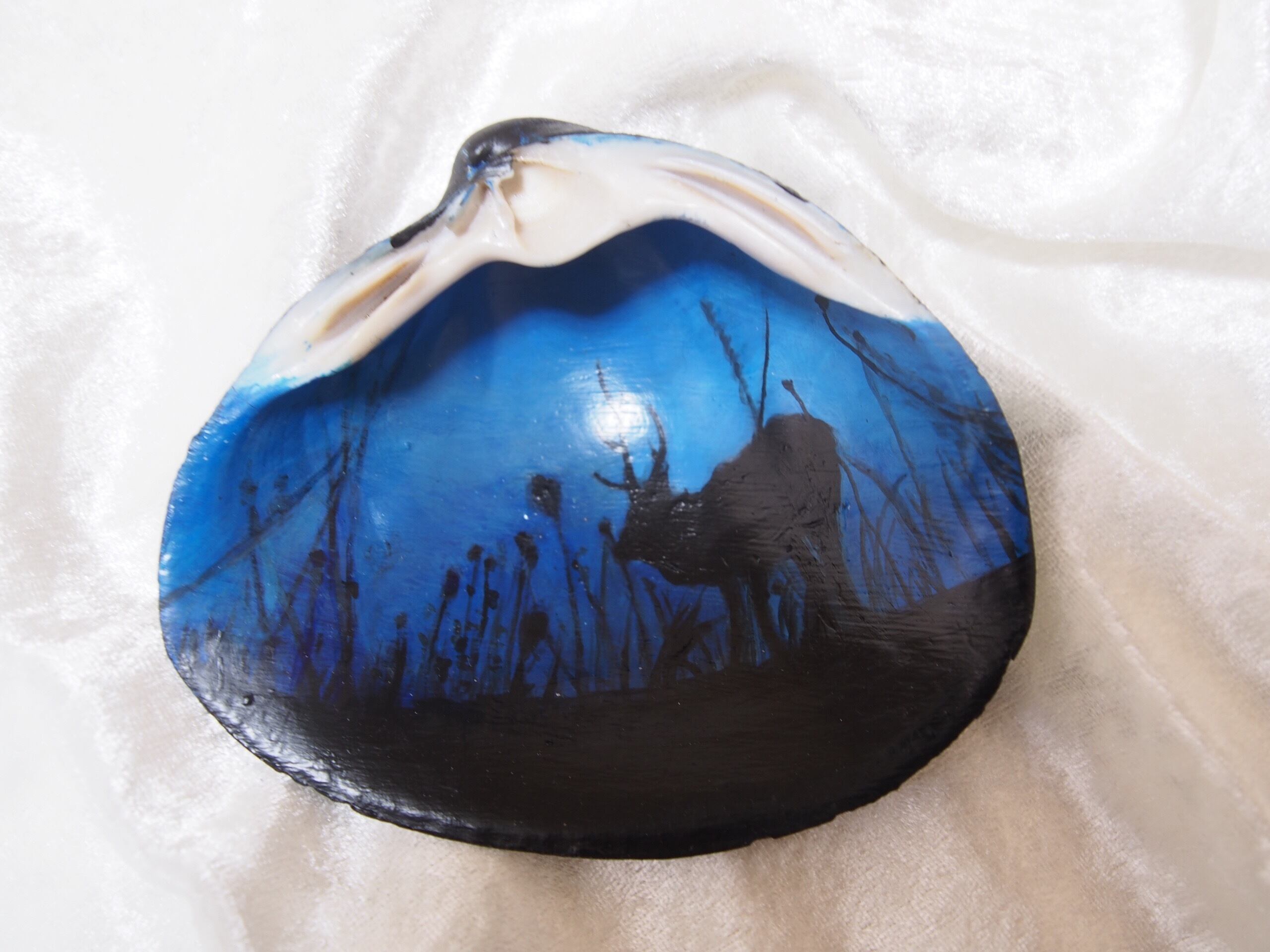 横10センチほどの、小樽の海で拾ったホッキ貝にアクリル絵の具で描いています。
