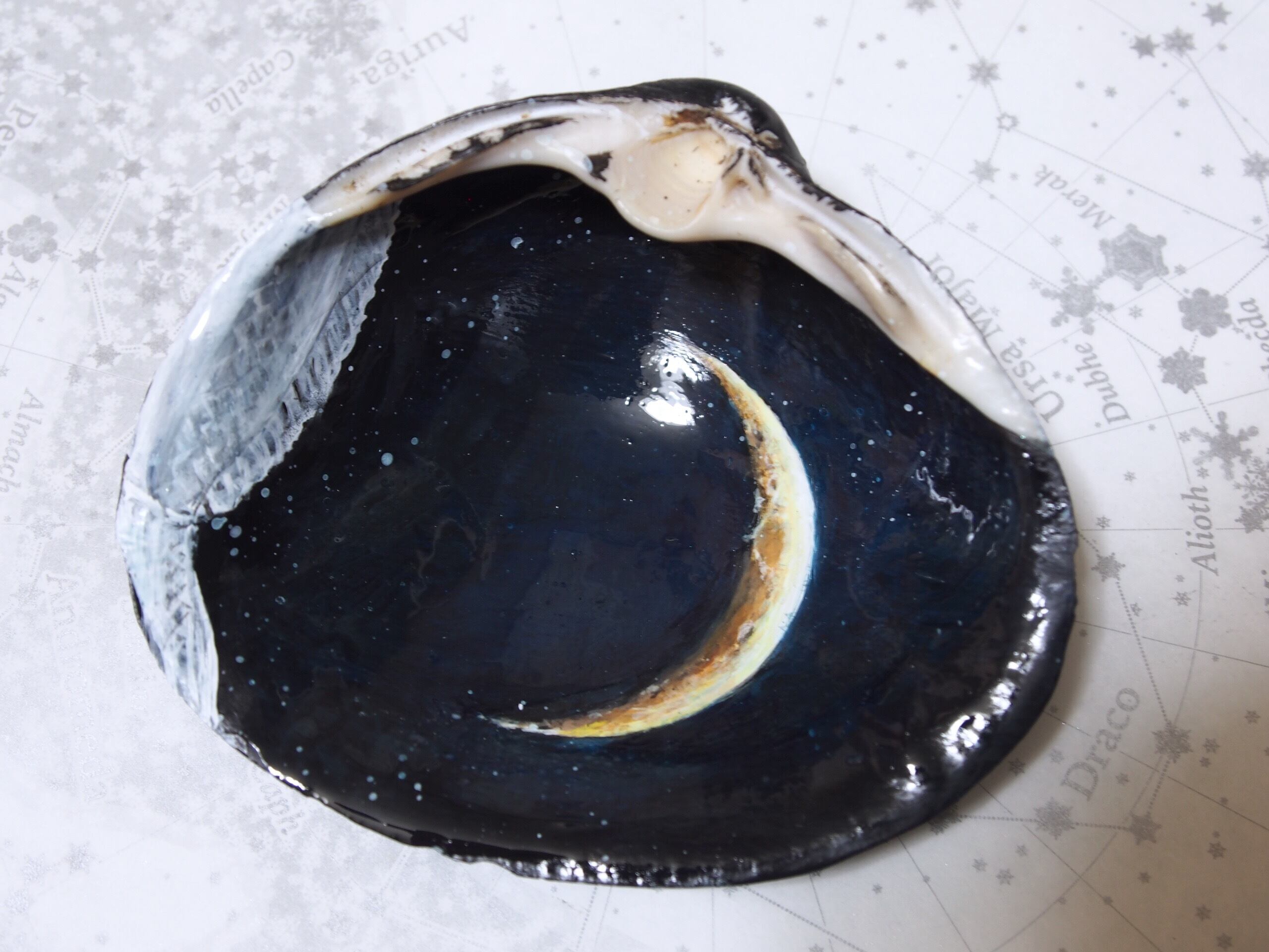 小樽の海で拾った貝殻にアクリル絵の具で、月を描きました。