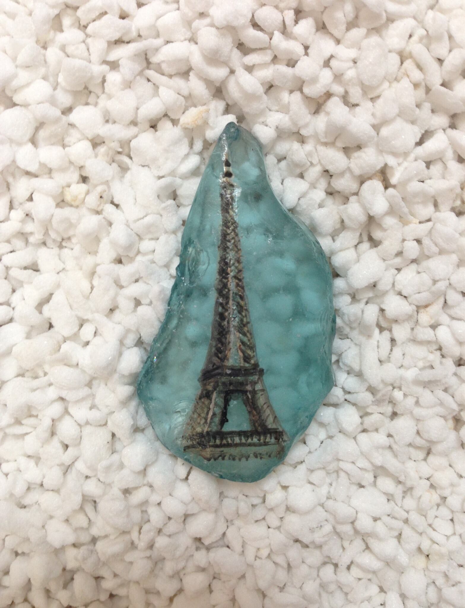 海で拾ったガラスにアクリル絵の具でエッフェル塔を描きました。