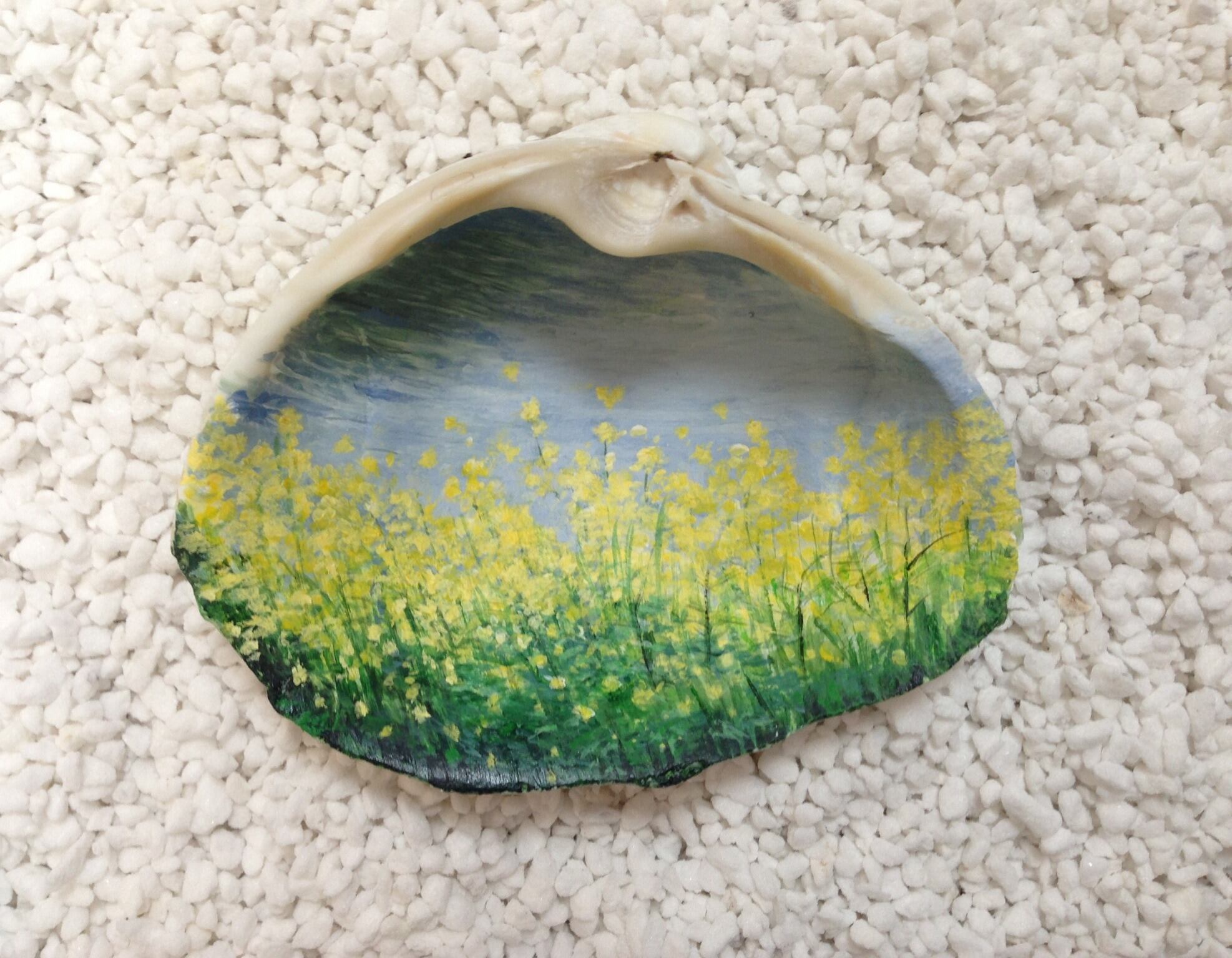 海で拾った貝殻にアクリル絵の具で、菜の花を描きました。