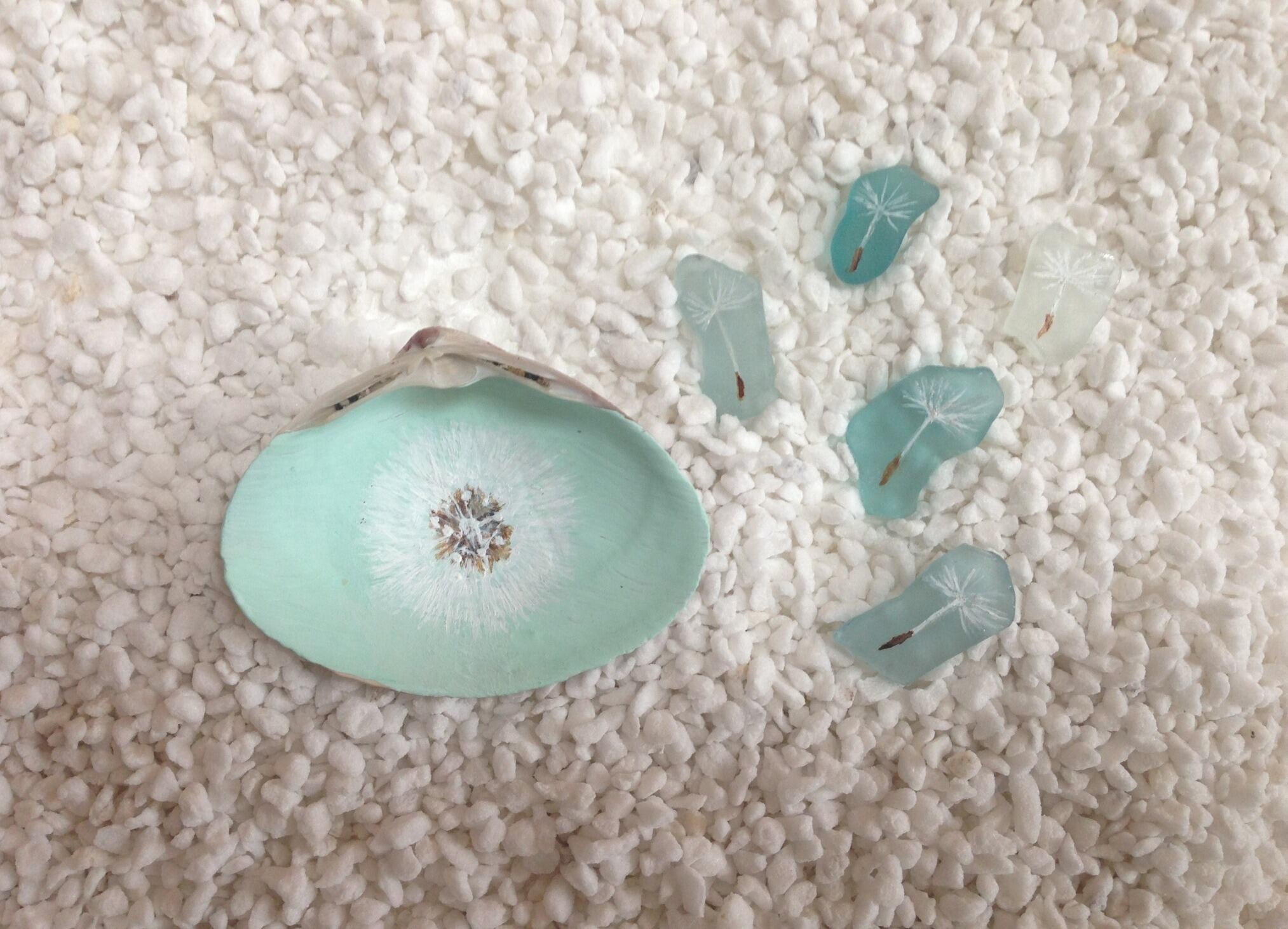 海で拾った貝殻とシーグラスにアクリル絵の具で、たんぽぽの綿毛を描きました。