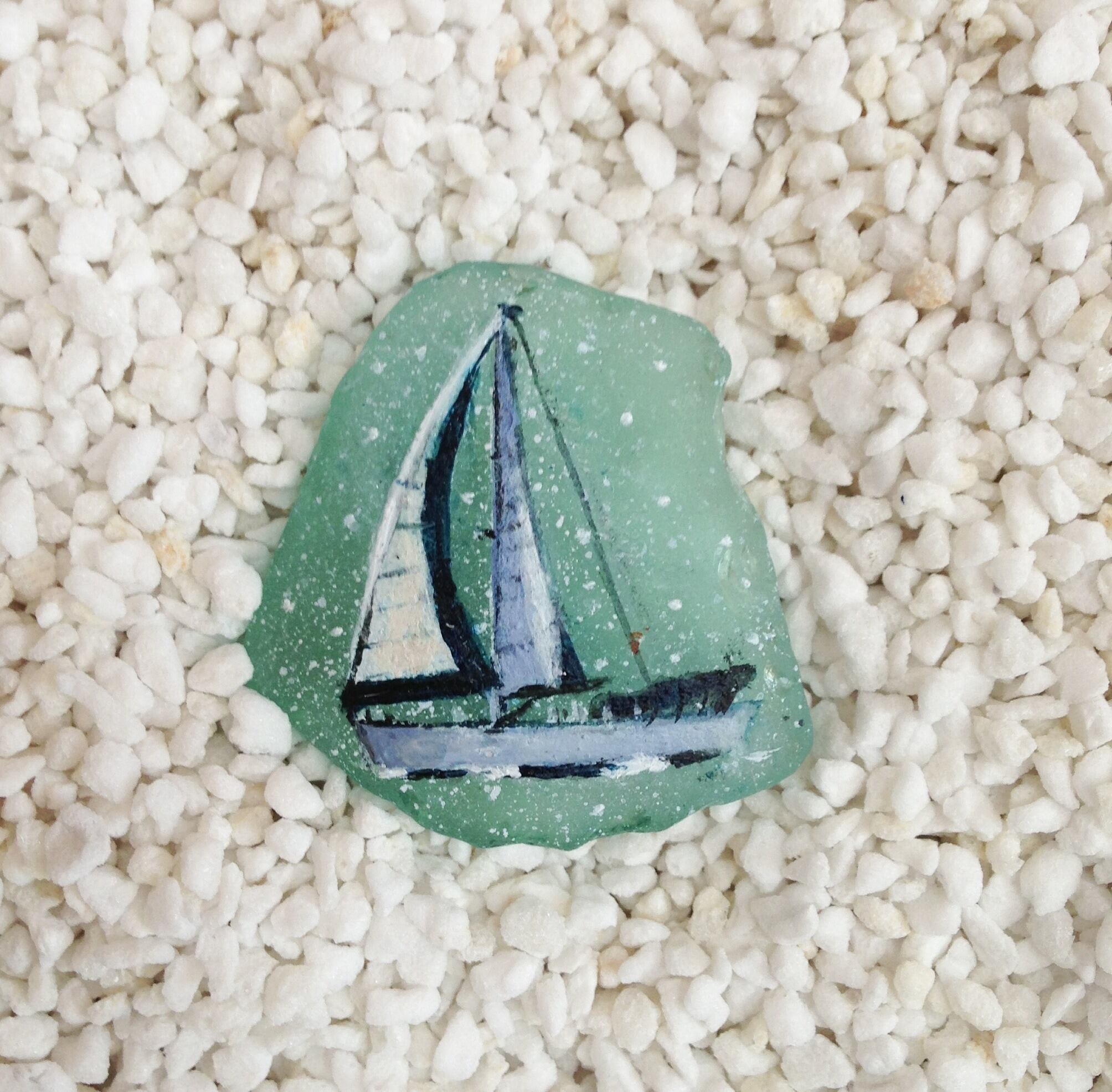 沖縄の海で採れたシーグラスに、アクリル絵の具でヨットを描きました。