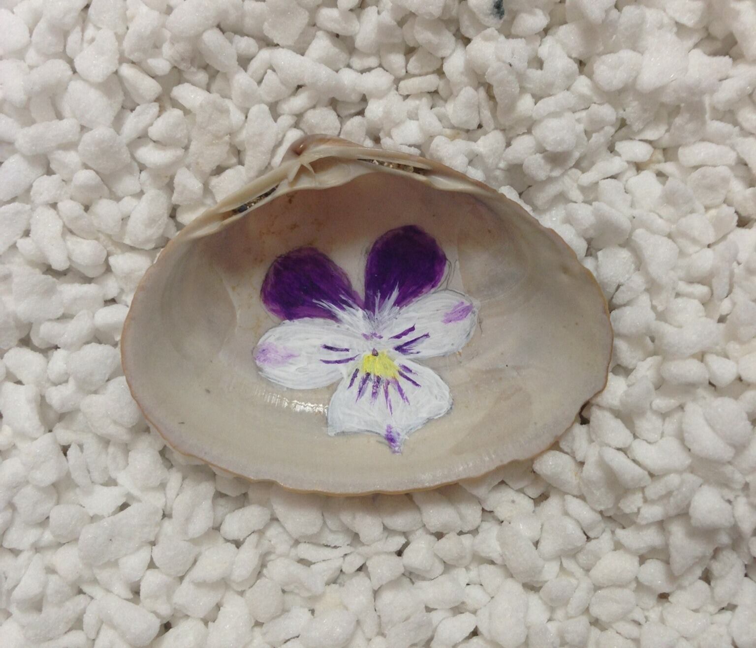 海で拾った貝殻にアクリル絵の具で、すみれを描きました。