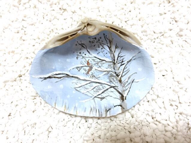 海で拾った貝殻にアクリル絵の具で、白樺の木のある風景を描きました。