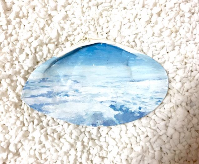 海で拾った貝殻にアクリル絵の具で、雲の上の景色を描きました。