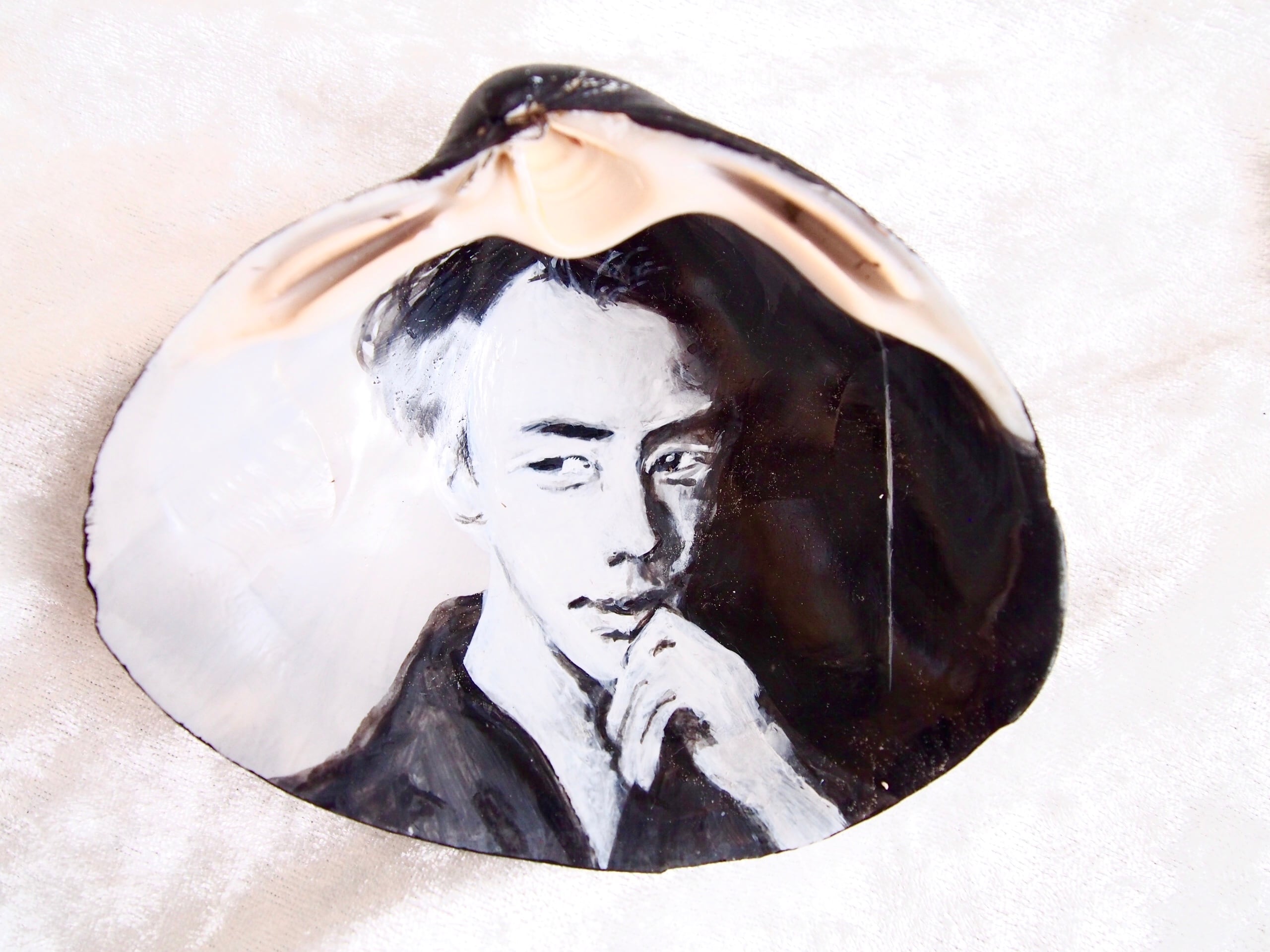 殻長(横の長さ)約10cm、小樽の海で拾った北寄貝(ウバガイ)にアクリル絵の具で描きました。