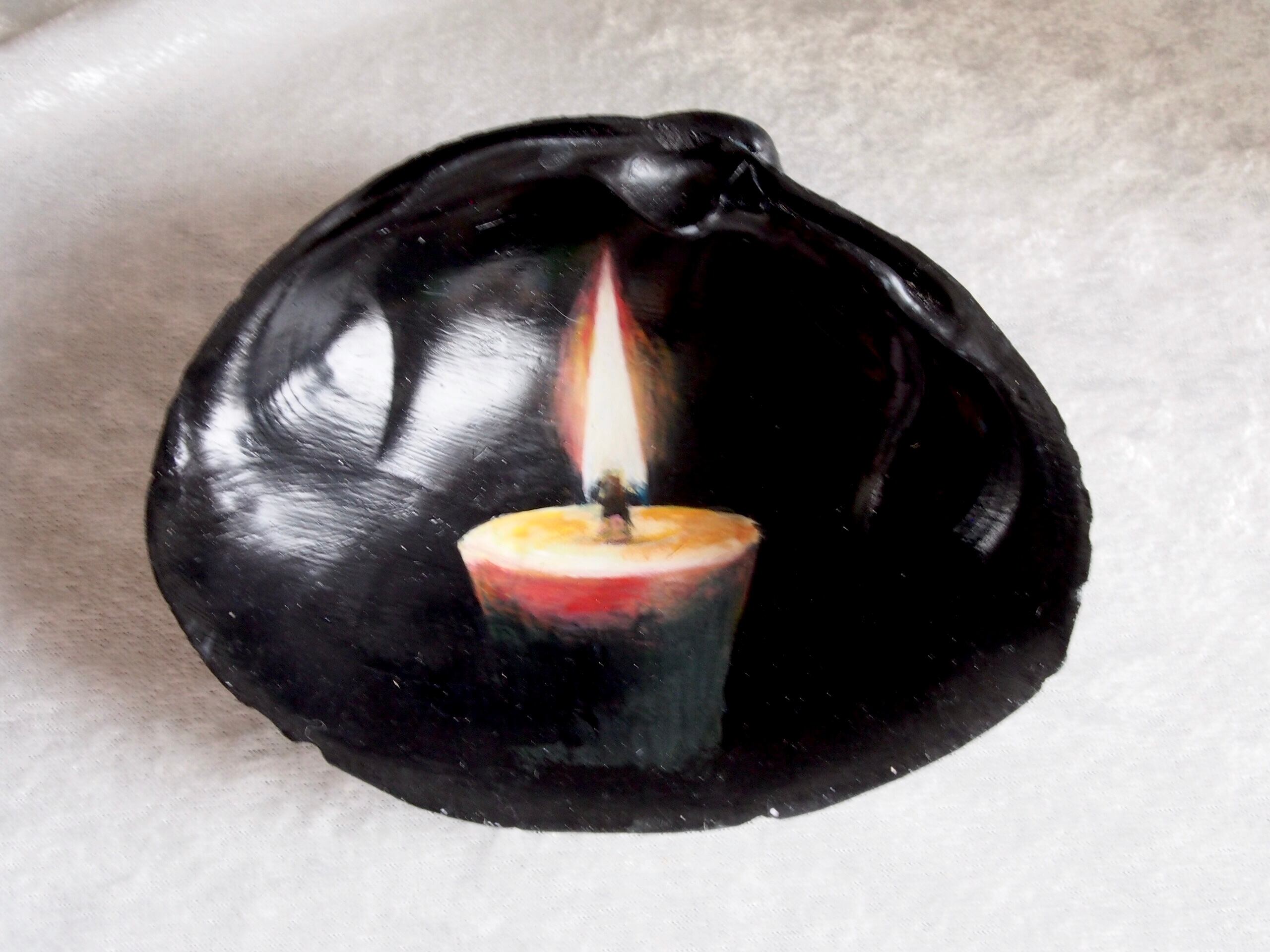 横の長さは約10cm、小樽の海で拾った貝殻に描きました。